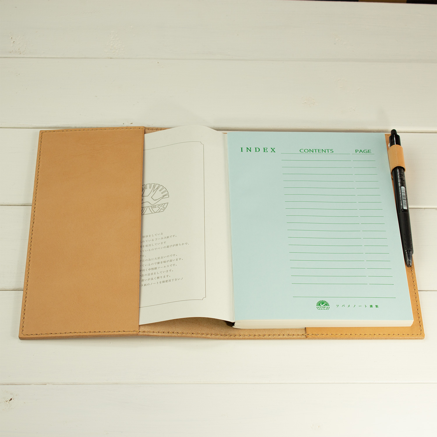 シンプルなデザインの左右ポケットにノートの表紙を差し込んで使う手帳カバーです。