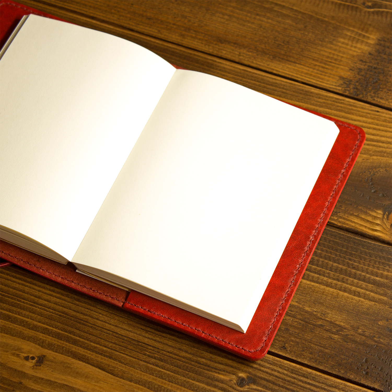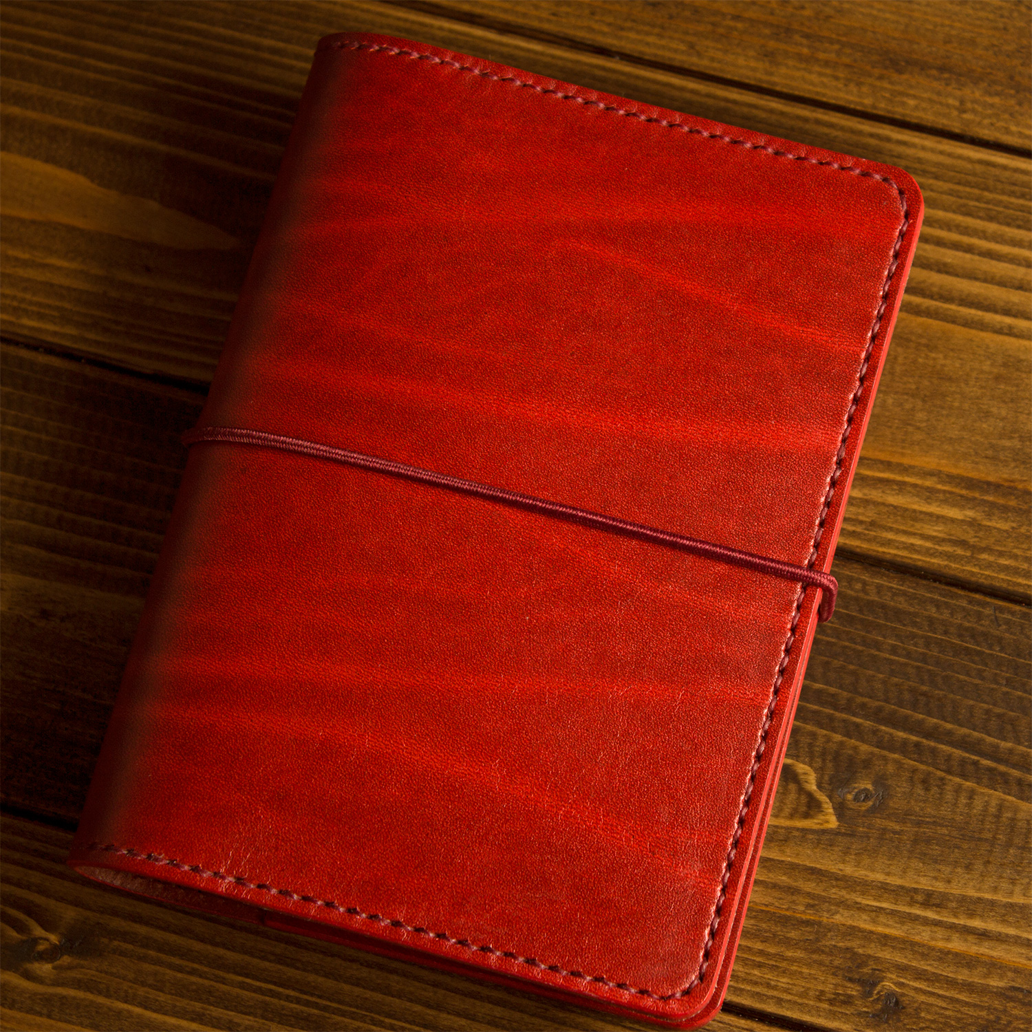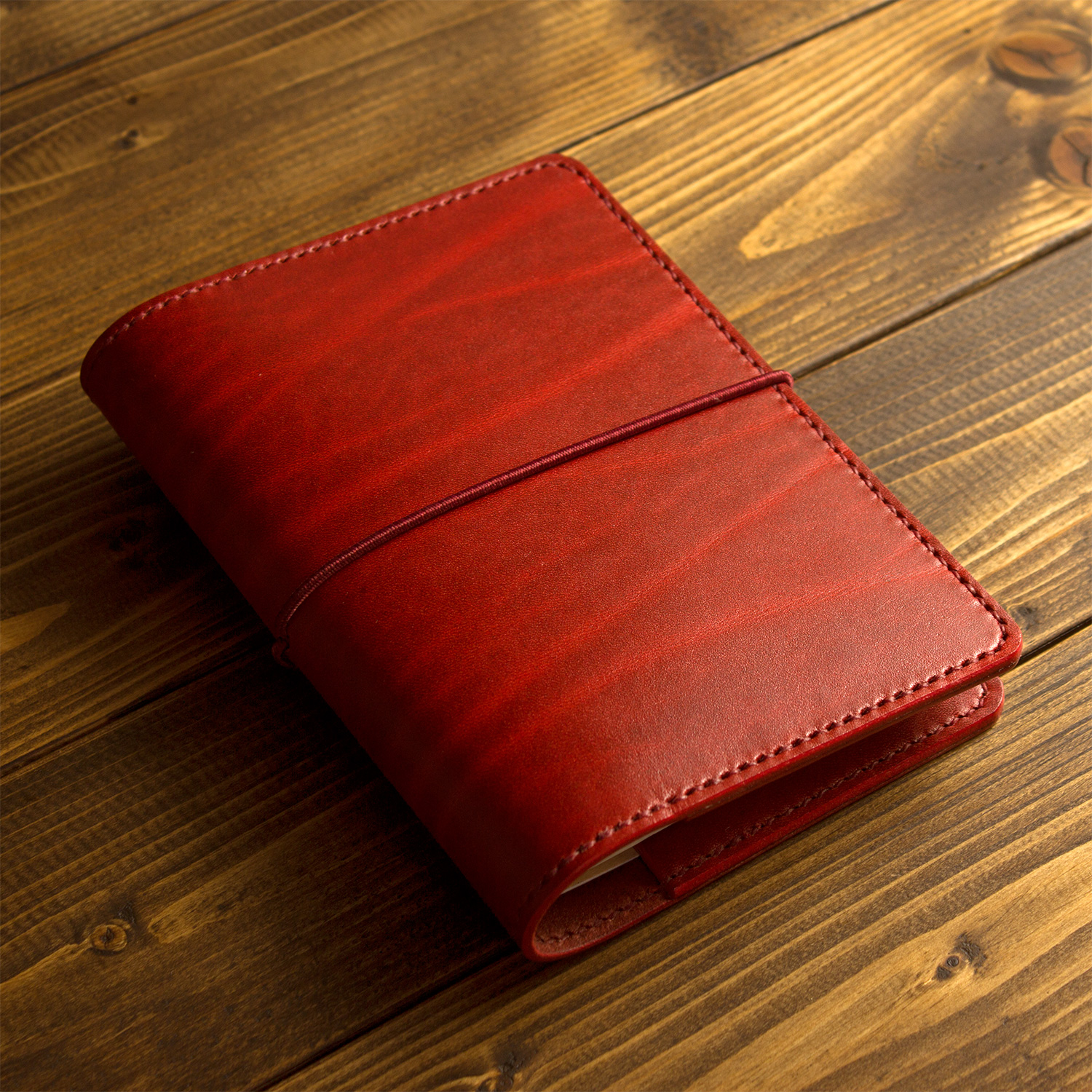 厚手の2mmのヌメ革を使用したシンプルなデザインの手帳カバーです。 閉じた時はゴムバンドで固定できますので、カバンに入れたときに開いてしまうのを防げます。